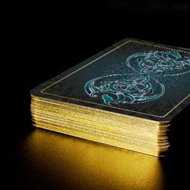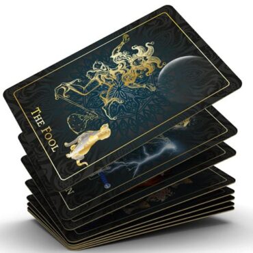 The eclectic range of images form a cohesive whole through consistent illustration style based on gold and silver line art. These illustrations are striking against the black damask background. Card size is standard Poker Size, (not the usual Tarot Card size). Poker size tarot decks are often referred to as a “café deck” or “travel deck” due to portability and ease of public shuffling and use on smaller tabletops.