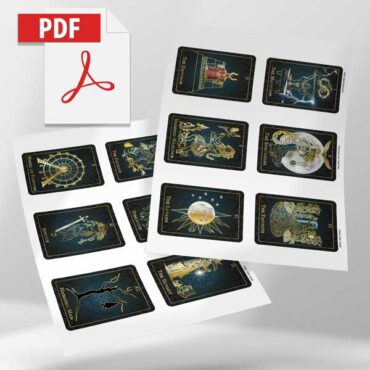 The images are eclectic, derived from a broad and diverse range of sources chosen to intuitively illustrate Rider Waite based meanings for each card; The artist’s choices will surprise and delight you.
